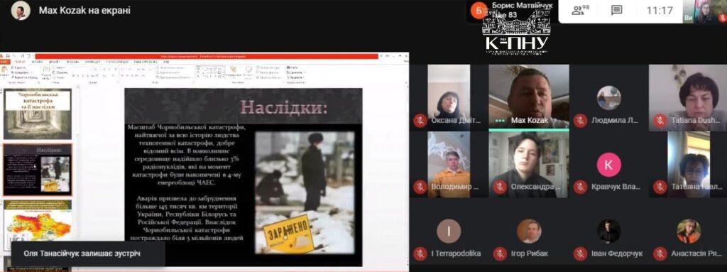 Викладачі природничо-економічного факультету організували онлайн-семінар «Чорнобиль: 35 років пам’яті», до якого долучилося понад 100 учасників. Хвилиною мовчання всі присутні вшанували тих, хто має відношення до аварії на ЧАЕС, але уже не з нами. Зі слізьми на очах учасники зустрічі слухали доповідь «Чорнобиль 86 очима очевидця», яку виголосив доктор біологічних наук, професор кафедри біології та методики її викладання Людмила Любінська.Про справжні масштаби аварії на ЧАЕС розповіла старший викладач кафедри екології Тетяна Душанова.Кандидат географічних наук, доцент, завідувач кафедри географії та методики її викладання Ігор Касіяник презентував доповідь «Концентрація кадмію в ґрунтах басейну р. Смотрич». Із наслідками аварії на ЧАЕС ознайомив нас кандидат біологічних наук, доцент кафедри біології та методики її викладання Максим Козак.